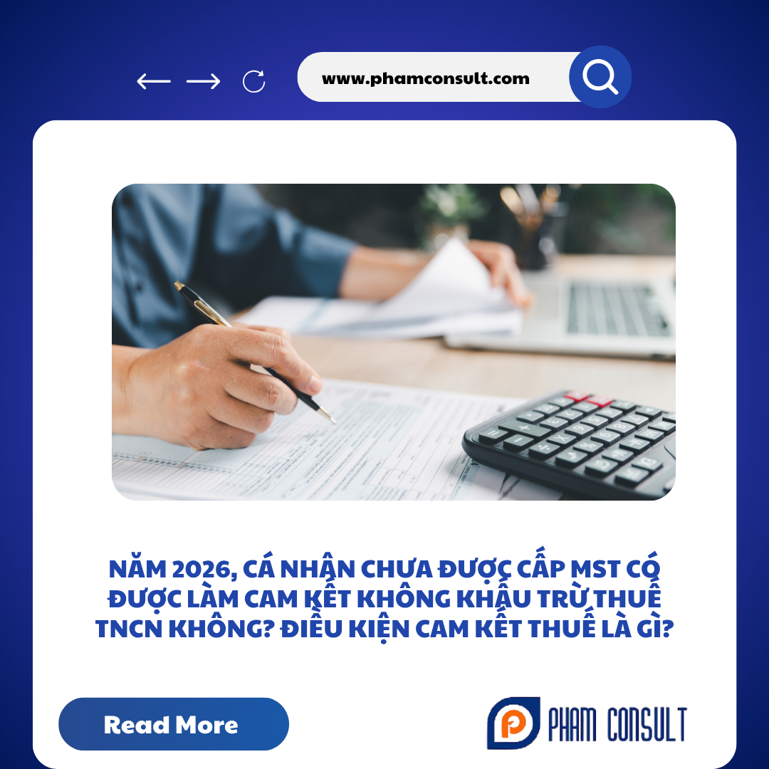 Theo quy định, cá nhân chưa được cấp MST sẽ không được làm cam kết không khấu trừ thuế TNCN. Xem chi tiết Điều kiện cam kết thuế TNCN 2026 bên dưới. Hãy cùng Phạm Consult tìm hiểu thêm nhé!